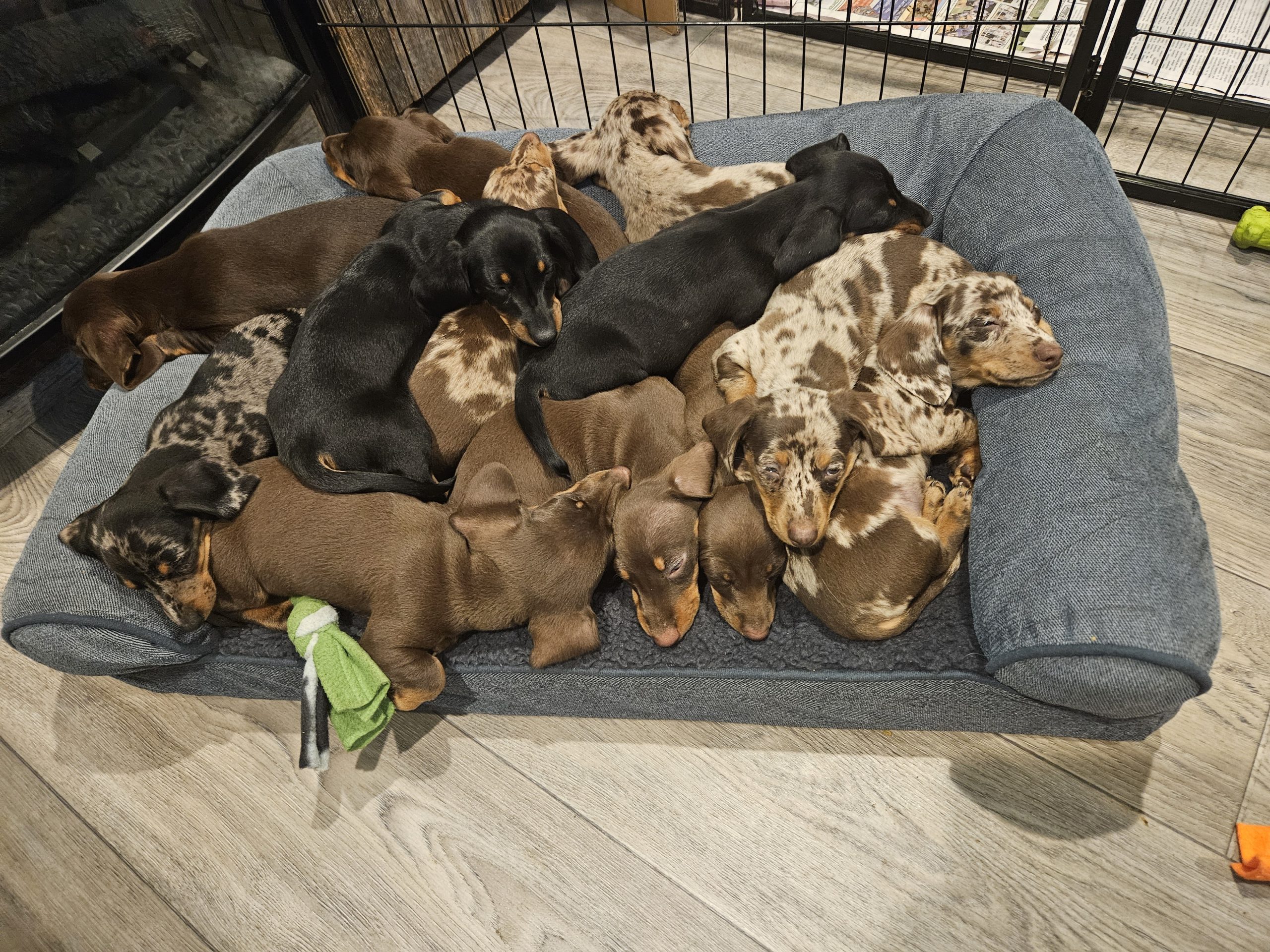 Every puppy is part of our family, raised in our living room for confident temperaments and an easy transition into yours. Playful, loyal, and endlessly devoted, Dachshunds bond deeply and want to be right by your side.